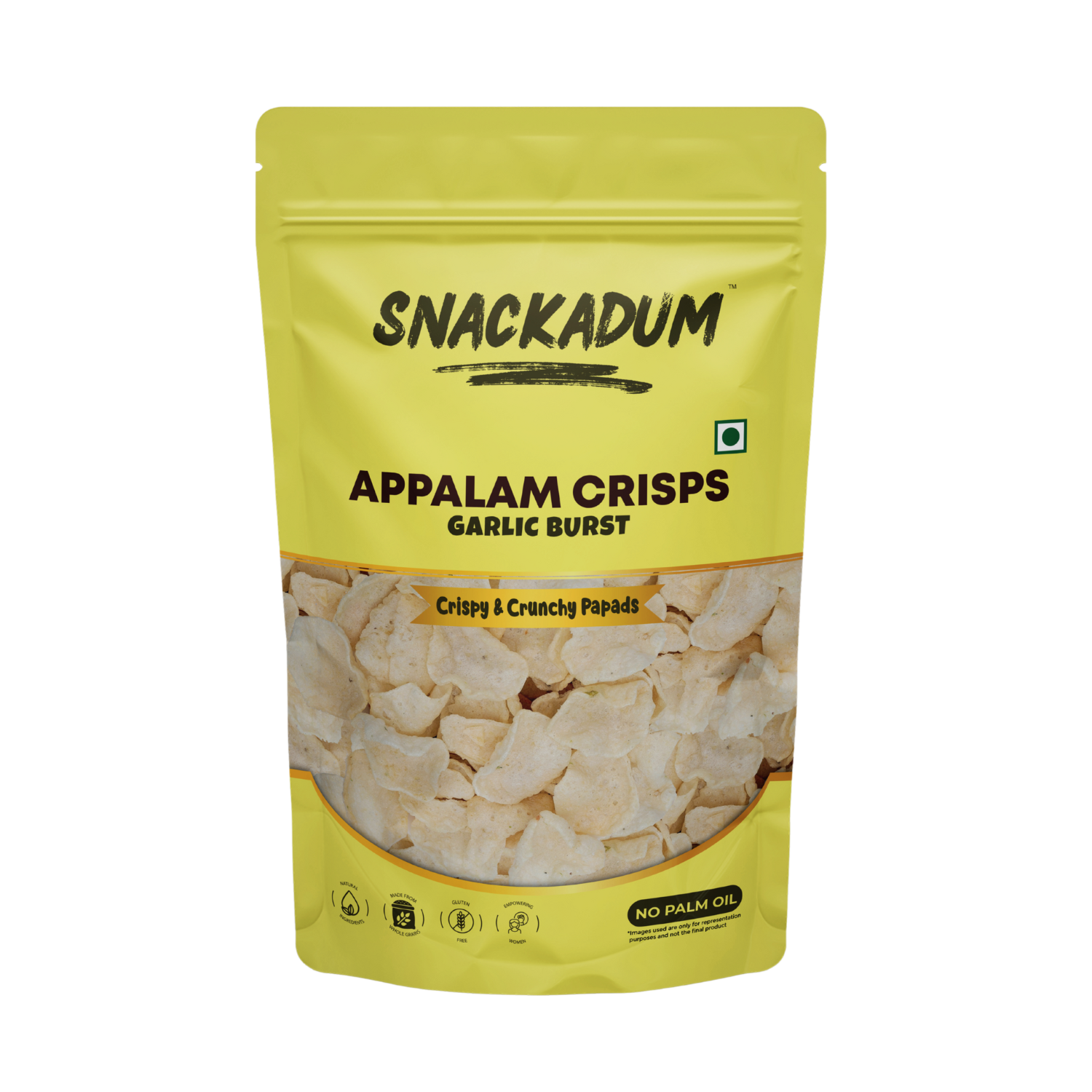 Appalam Garlic Burst Crisps take the timeless South Indian papadam and give it a bold, modern twist. Crisp, airy, and irresistibly crunchy, each bite is infused with the punch of roasted garlic that keeps you coming back for more. Made with real ingredients and no palm oil, these appalam crisps turn a familiar classic into an addictive anytime snack.
